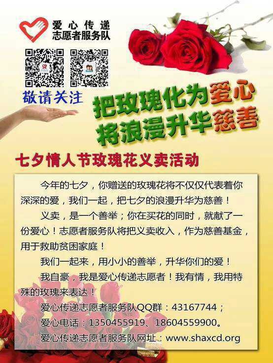 花香馥郁,爱满人心。2014年8月2日农历7月初七,绥化市爱心传递青年志愿者服务队的20多位志愿者走上街头,开展七夕鲜花义卖活动。经过志愿者们一天的努力共卖出400朵玫瑰、两束鲜花,义卖总收入1314元。这笔钱将作为帮助贫困家庭的救助金用于今后的活动当中,后期的款项使用情况也将接受媒体和志愿者的监督,具体义卖收入去向将在本网站、微信公众平台进行公示。