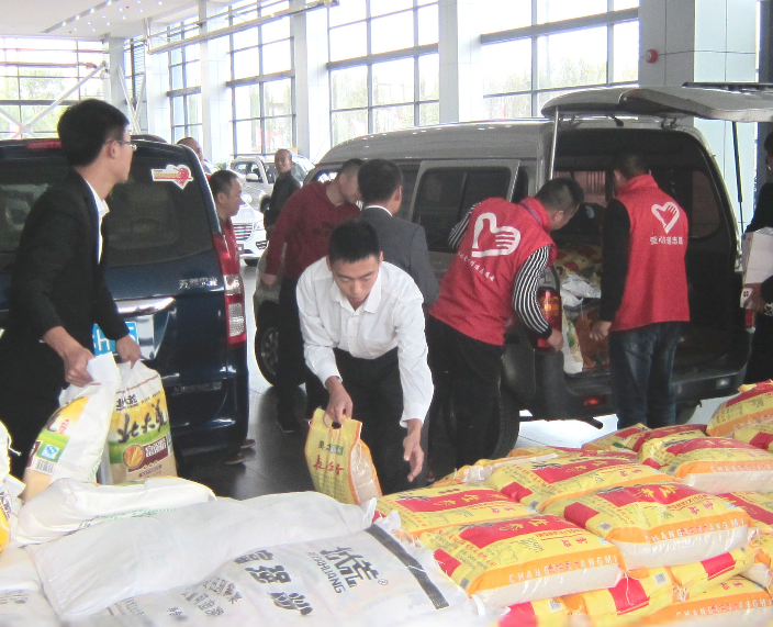 25日上午8点半之前,8台车、20名志愿者按时来到博能公司的哈弗4S店,马上分组、分线路、打印分配派送对象户数,然后是按照户数装车,一切都在有条不紊地进行着。