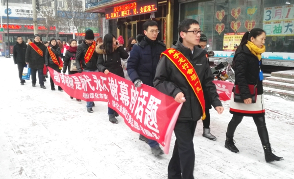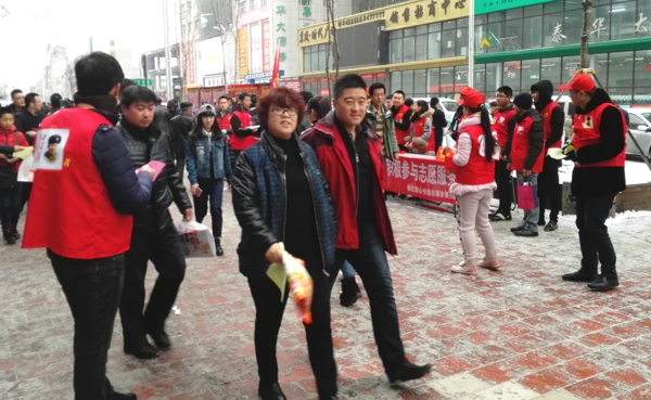今年的3月5日,从早上开始飘落的春雪,落到地面,有的逐渐化成雨水,积雪和雨水混合在一起,路面湿滑。落在人身上的雪,也会化成雨水,浸入衣服。如此这般的天气,丝毫没有影响到绥化市北林区的100多名志愿者,他们在这特殊的一天用各种活动方式纪念雷锋,宣传雷锋,弘扬着雷锋精神。