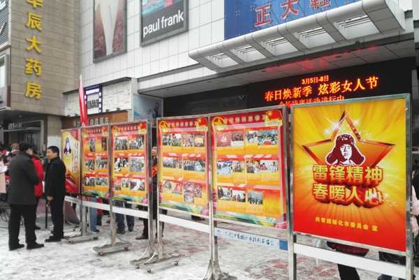 还有一项活动是沿繁华街道的徒步宣传。数十名志愿者高举志愿者服务队的旗帜,队列两侧是学习雷锋的宣传标语,志愿者的身上粘贴着雷锋头像,他们用这种方式提醒人们,今天是“学雷锋纪念日”。很巧的是,队伍行进中,在一个商家门前的扩音器当中传出了一手响亮的合唱歌曲——《学习雷锋好榜样》!