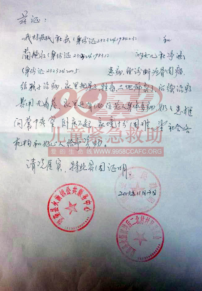 杜净涵,女,出生于2005129日,家在黑龙江,患骨肉瘤。