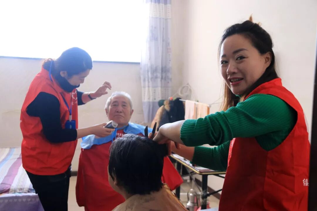 不方便出行的老人,志愿者们就到房间里帮助老人理发,同时辅助理发、打扫房间的志愿者们紧密配合,默契十足。