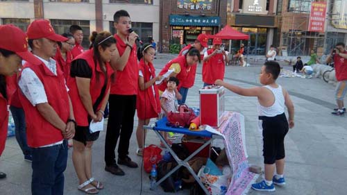 图为6月28日,绥化爱心传递志愿者来到西湖公园,在这里为小益嘉做最后一天的募捐,附近居民、商家共为小益嘉捐款6000余元。