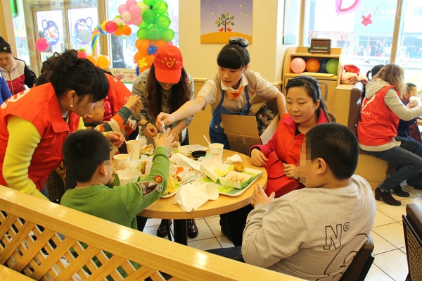 随后,协会会员和爱心传递志愿者服务队的志愿者领着新起点自闭症康复训练中心的30多名自闭症儿童来到德克士体验外出就餐,为孩子们过节日。协会会员和志愿者们耐心地同孩子们聊天,嘘寒问暖,虽然孩子们没有什么回应他们的热情,但他们依然用最灿烂的笑容去面对孩子们。