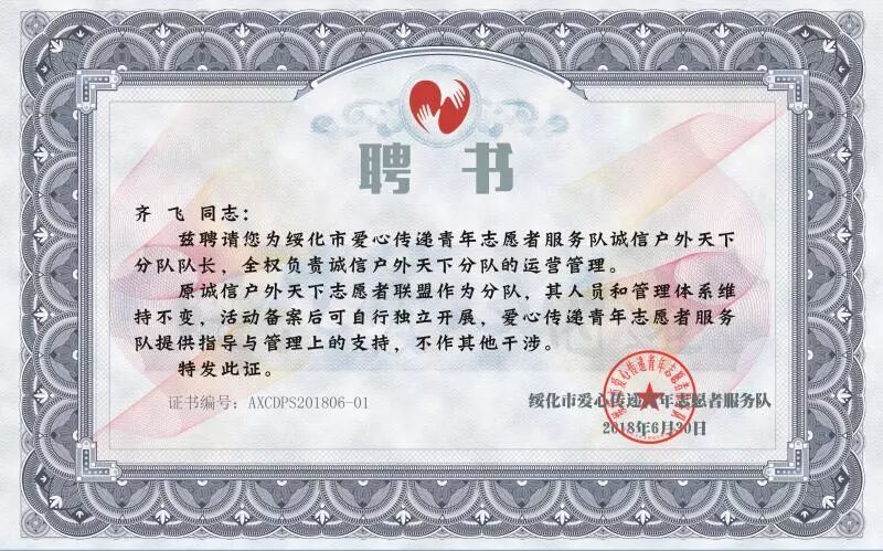 1.将原“诚信户外天下志愿者团队”更名为“绥化市爱心传递青年志愿者服务队诚信户外天下分队”;
